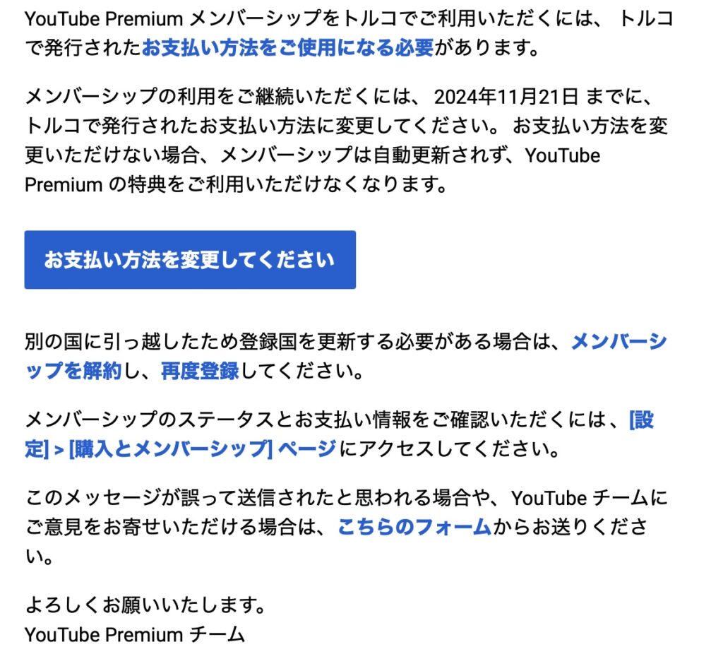 メンバーシップの利用をご継続いただくには、2024年11月21日 までに、トルコで発行されたお支払い方法に変更してください。お支払い方法を変更いただけない場合、メンバーシップは自動更新されず、YouTube Premium の特典をご利用いただけなくなります。